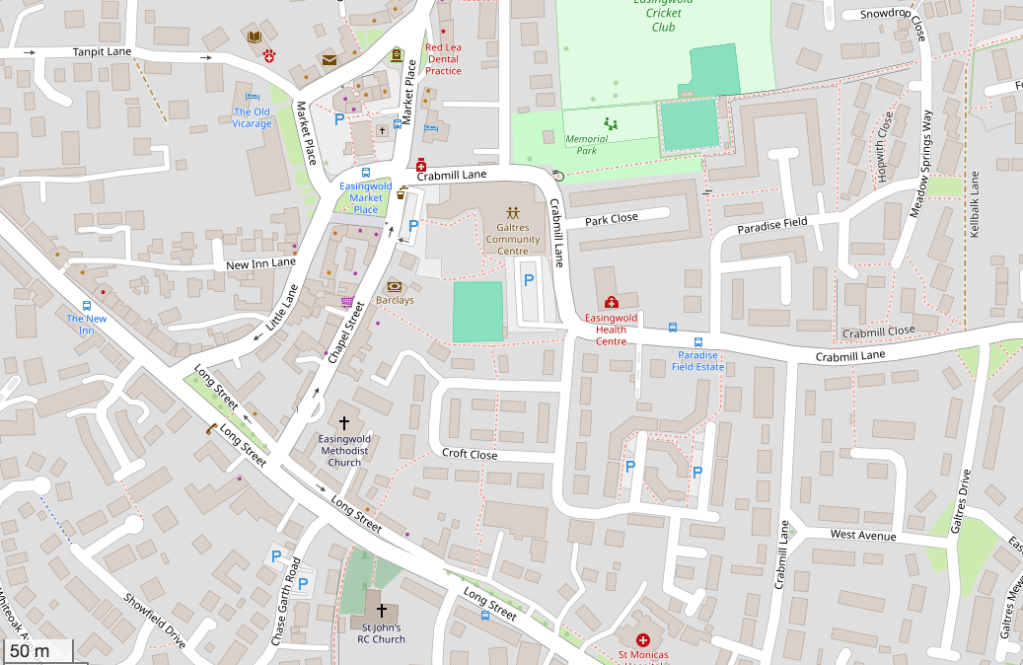 courtesy : © Open Street Map (Note: The text commentary on the map above is an short abbreviation for our Roman Catholic church. Please note the Church of England Parish Church for the Town has a similar abbreviated name, whilst located off the map above. )