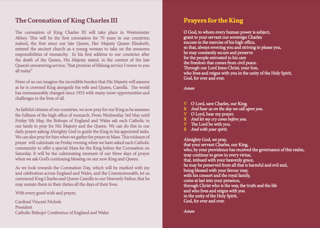 The Catholic Bishops of England and Wales have enjoined us to pray for HM The King at the time of his coronation, and indeed beyond.