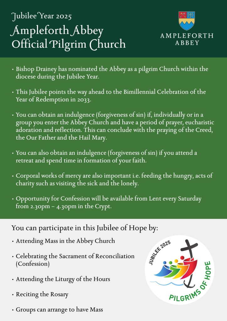 Ampleforth Abbey is one of the Official Pilgrim Churches in the Diocese for Jubilee 2025. Click on the poster alongside for details (open image in a new tab, and print as appropriate), and see the article in January edition of the Middlesbrough Diocesan Voice.